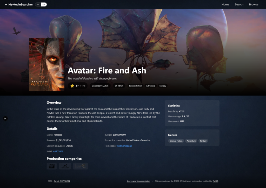 MyMovieSearch is a modern full-stack web application designed to search, explore, and discover movies and TV shows using data from the TMDB API. The application offers a unified search experience, advanced browsing filters (genres, ratings, release dates, runtime, and more), and detailed media pages displaying comprehensive information such as synopses, cast, production details, and official links.